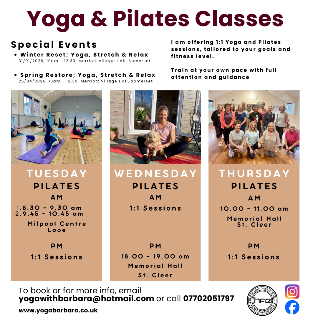 Hi, I am Barbara Dunlop. I teach Pilates and Yoga in South East Cornwall and Somerset.